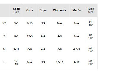 | Sock Size | Girls | Boys | Women's | Men's | Tube Size | |
