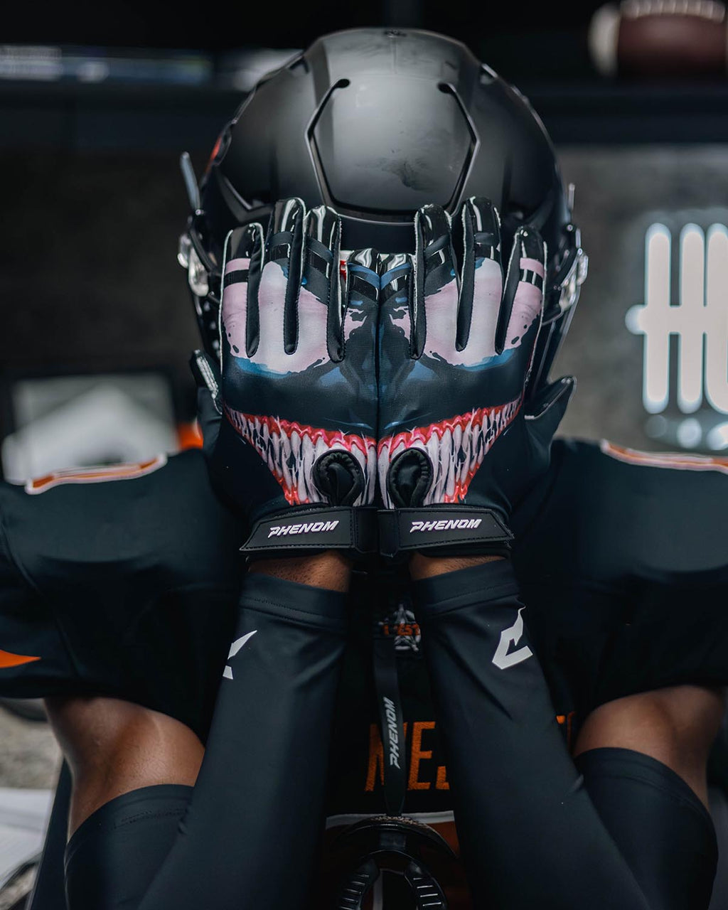 Step into the shadows and take over the game with the Phenom Elite “Villain” Football Gloves.
